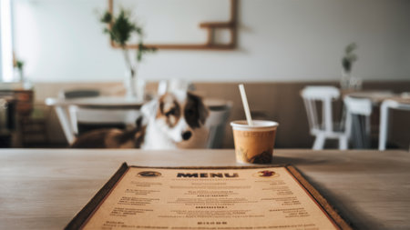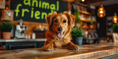 Smiling dog at the counter of an animal-friendly cafe, promoting a welcoming environment for pets. High quality photo