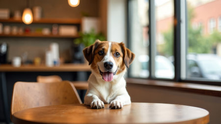 Сurious dog sits calmly at empty table in cozy cafe, gazing thoughtfully out the window. Dog friendly place. Perfect for pet lovers. Animal waiting its order in restaurant