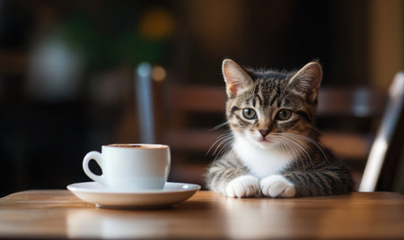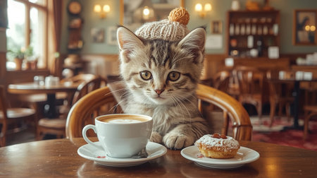 A playful kitten with a knitted hat sits at a cafe table, curiously looking at a cup of coffee and a sweet pastry. The warm atmosphere is inviting and charming