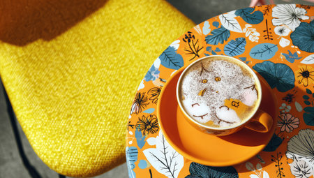 A close-up shot presents a cappuccino, topped with a design, placed on an orange saucer on a patterned table. The vibrant color palette includes orange, yellow, and blue. The composition is bright, suggesting a sunny day setting, ideal for cafe or lifestyle-themed commercial purposes.