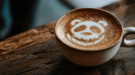 This artistic coffee latte showcases a charming panda design created with foam, served in a rustic cup on a wooden table, perfect for cozy moments.