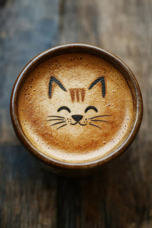 A delightful cup of coffee showcases intricate latte art depicting a smiling cat face. The beverage is served in a rustic wooden cup, placed on a weathered table in a cozy cafe, creating a warm afternoon ambiance.