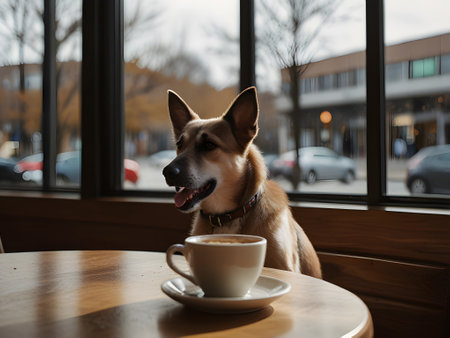 Pet friendly coffee shop concept. Lifestyle and pets concept with a cut dog in an urban setting. Generative ai.