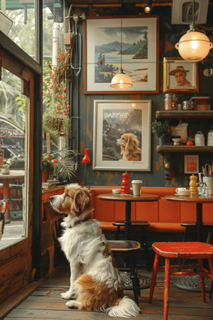Dog sitting in cozy vintage cafe interior looking out the window. With Generative AI technology.