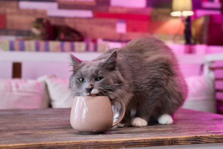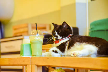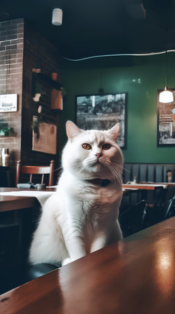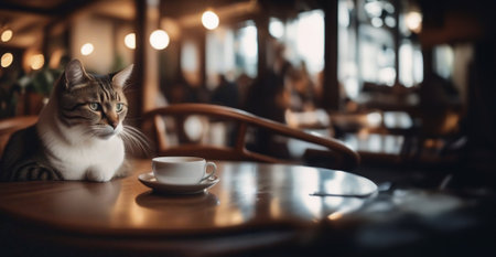 cute cat sits at a table in a cafe, cozy light in the cafe. concept of cafe and aesthetic pleasure