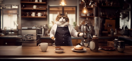 cat barista in a coffee shop in a barista uniform, concept of work in a cafe coffee shop restaurant.