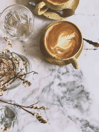 Morning coffee in ceramic cups with foam and a pattern of plants leaf on marble table. Top view. Aroma fresh latte.