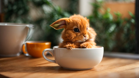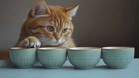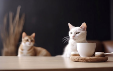 Playful Pet Sniffing Coffee Cup on Table Scene. Concept Pet Photography, Coffee Table Setup, Playful Pets, Scene Composition, Lifestyle Photography