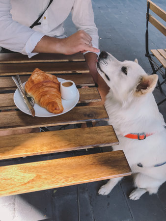 Family on breakfast in morning city. Stylish man with his dog sitting at wooden table with croissants and coffee in cafe terrace. Funny moment