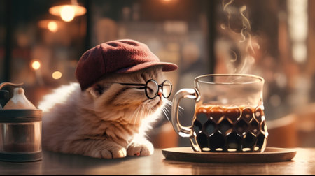 A cat wearing glasses and a hat sitting next to a cup of coffee. Generative AI image.