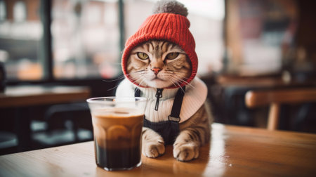 A cat wearing a red hat and sweater sitting next to a glass of coffee. Generative AI image.
