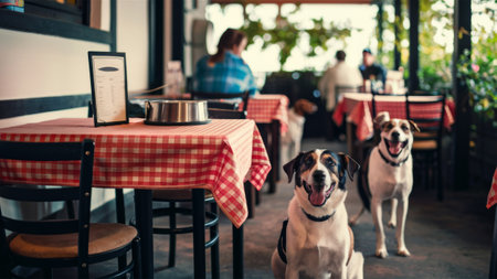 Two dogs are sitting at a table in an outdoor restaurant, AI