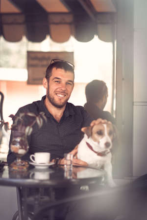 Portrait of young smiling man and cute purebred dog jack russell terrier sitting on the knees of person at table in cafe.