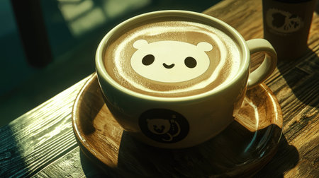 A delightful bear-shaped latte art sits in a warm cafe. The cozy atmosphere and soft light create a perfect setting for coffee lovers.