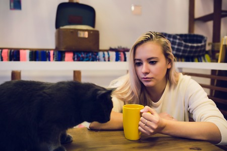Girl in warm sweater drinking coffee with red cat on her lap in cat cafe.