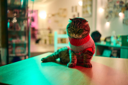 A Festive Cat Wearing a Sweater and Surrounded by Cozy, Warm, and Twinkling Lights