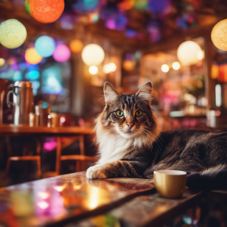 A soft, long-haired feline relaxes beside a steaming mug as golden sunlight filters through, creating a soothing, intimate cafe scene filled with gentle bokeh glows.