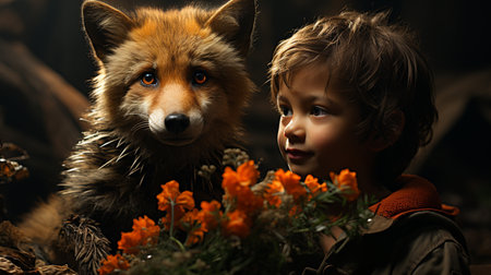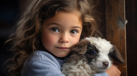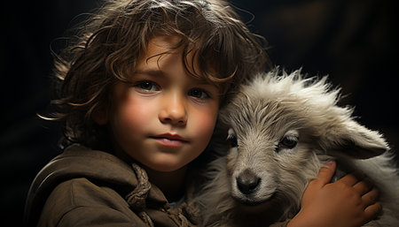 Cute child embraces playful puppy, radiating innocence and joy generated by artificial intelligence
