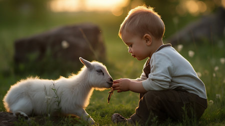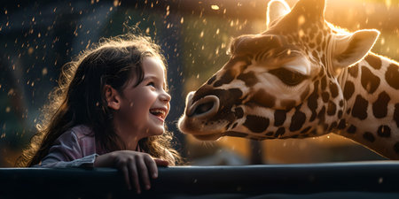 A young child interacting with a gentle giraffe in the warm, glowing light of the setting sun. A.I.