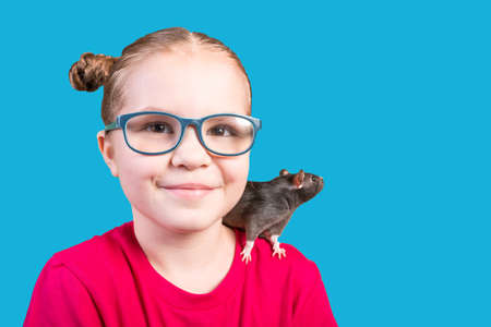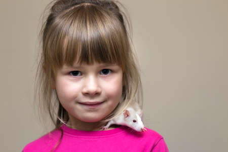 Portrait of happy smiling cute child girl with white pet mouse hamster on light copy space background. Keeping pets at home, care and love to animals concept.