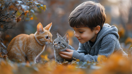 A joyful child sits on the ground, gently petting a rabbit while a curious cat observes nearby. Warm autumn colors surround them, creating a serene atmosphere.