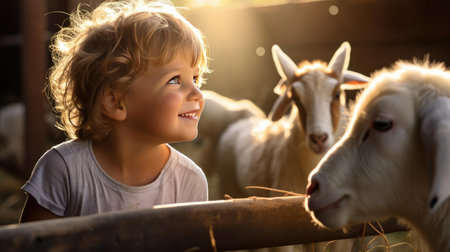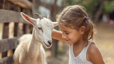 A child and a goat. Portrait of a girl with a farm animal on the farm