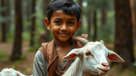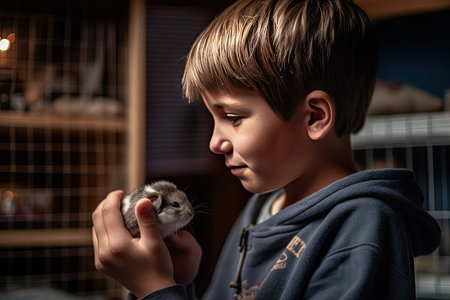 a young boy holding a small white mouse in his right hand and looking at the camera while he holds it. Generative Ai