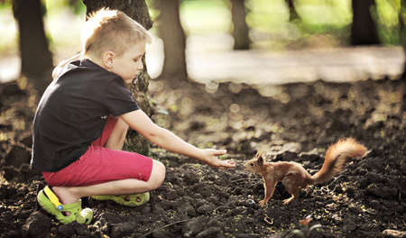 A young child examines animal figurines surrounded by real plants and autumn foliage in a serene environment.