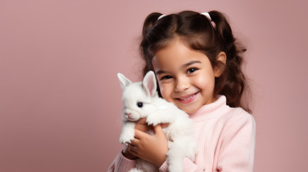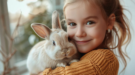 Adorable Girl with Blue Eyes and Pet Bunny. Cozy Childhood Moments