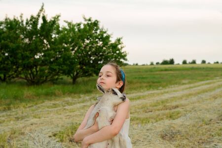 girl with baby goat on farm outdoors. Love and care. Village animals. happy child hugs goat, concept of unity of nature and man. Friendship of child and animals. Happy childhood. Girl and goat