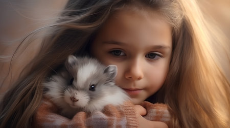 Young Girl Enjoys Warm Moment With Her Guinea Pig Under Soft Lights During a Cozy Evening at Home. Generative AI