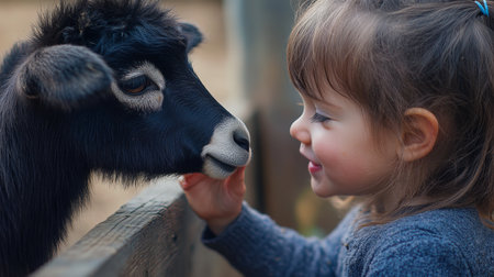 Girl interacts closely with a small goat, showcasing a heartwarming moment in a snowy environment