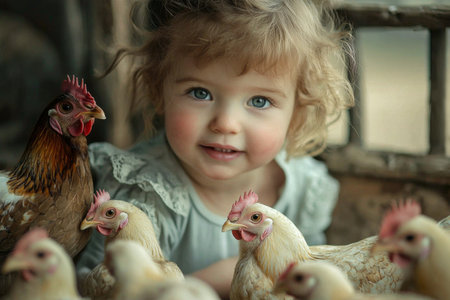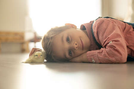 Cute child at home with little newborn chicks, enjoying, cute kid and animal friend in a sunny room