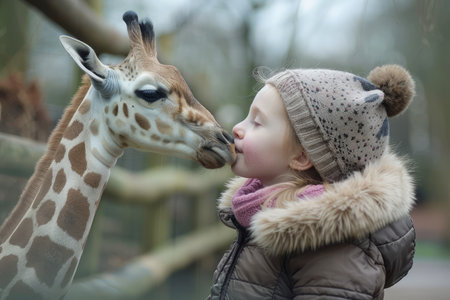 Young Child in Warm Clothing Sharing a Gentle Moment with a Giraffe at a Zoo AI Generative
