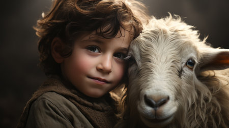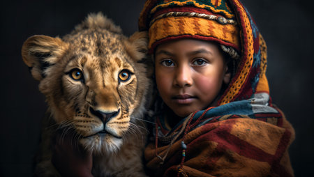 An AI generated illustration of a young child next to a lion cub, which appears to be affectionately embracing her