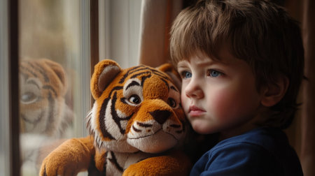A young boy gazes at a lion in a peaceful setting during sunset, capturing a unique bond.