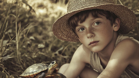 young man with freckles and a straw hat sitting with a turtle generative ai