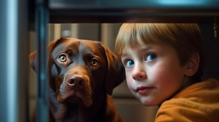 Generative AI shows a little child and an adorable Labrador Retriever searching for food in their refrigerator at home.