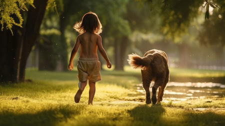 Behind a child running barefoot on the grass in a park with a dog, the soft morning light