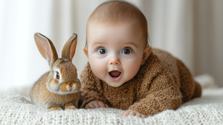 In a bright and cozy room, a delighted baby wearing a knitted sweater lies on a textured blanket beside a charming rabbit. The joyful expression reflects a magical bond between them.