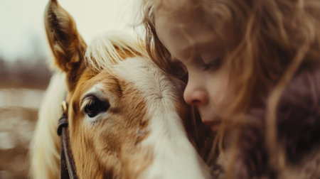 Caucasian girl in winter clothing hugging a brown horse in a snowy outdoor setting. Concept of child affection, bond with animals, winter season, nature, kid and pony.