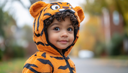 Young child is holding a small pumpkin while wearing a tiger costume for halloween