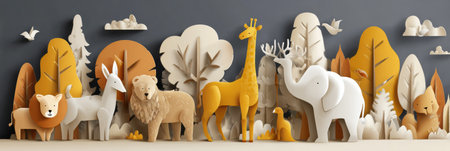 Various papercut animals, including a lion, deer, giraffe, and elephant, stand amongst colorful trees and white clouds against a dark blue background.