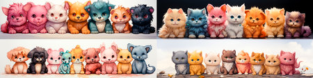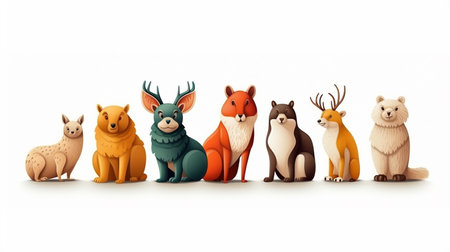 Group of cartoon animals lined up in a row Playful and colorful characters Ideal for children's books or educational materials Cute and whimsical design