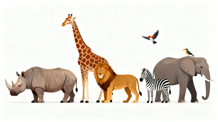 African set of animals painted with watercolors on a white background in a realistic manner and colors. Ideal for teaching materials, books and nature-themed designs. created by AI