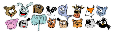 Animal faces set funny. hand drawing. Not AI, Vector illustration.