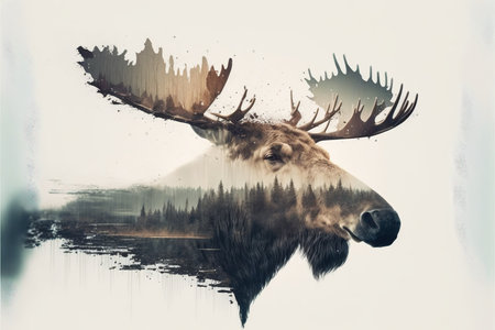Moose with beautiful antler double exposure with natural background as concept of fertility forest and wildlife live together in peace, explore and adventure in wilderness. Superb Generative AI.