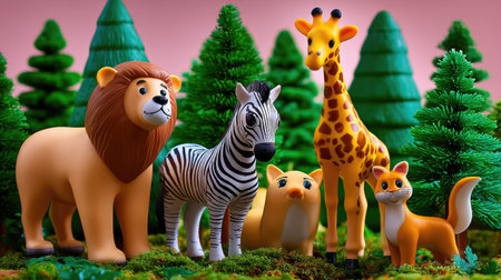 A vibrant display of colorful plastic animal figurines including a lion, zebra, giraffe, fox, and cat set against a lush green forest backdrop. Perfect for children's playtime.