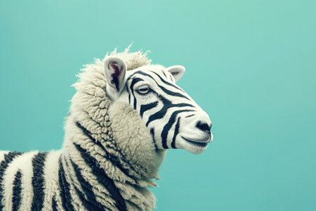 An AI generated illustration of a portrait of a sheep with a zebra pattern against a blue background