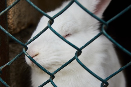Decorative rabbit close-up in cage at animal farm. The muzzle is sticking out of the cage